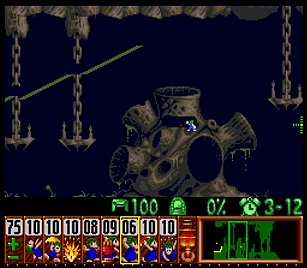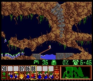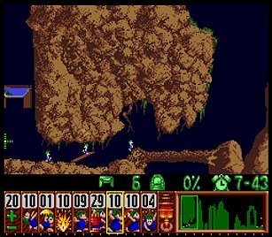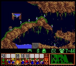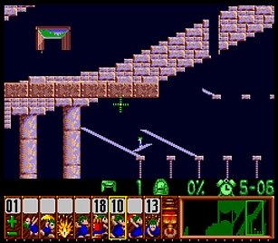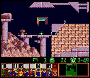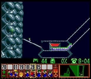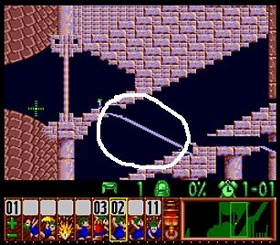 まずは左方向に進めるために、折り返してきたところを縦掘り→階段・・・とか色々で進めていく。問題は図7の空間にこしらえる階段だが、これはレミングス自体が壁に当たってしまうので、どうしても折り返してしまう。ここは丹念に、折り返したら階段キャンセルを使ってパワープレイで無理矢理階段を作ろう。他にスマートなやり方があるかもしれないが、結果オーライで。