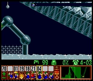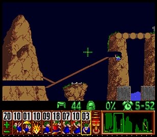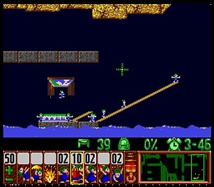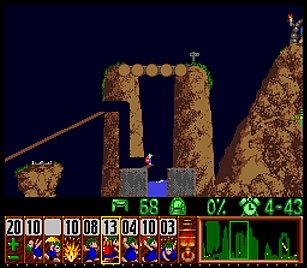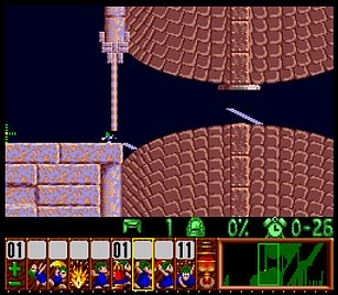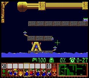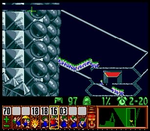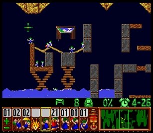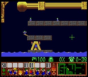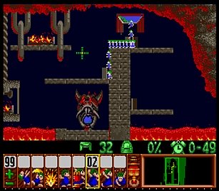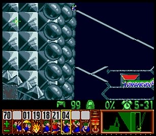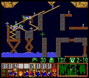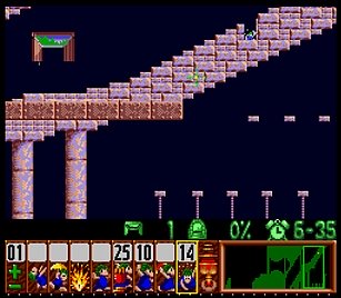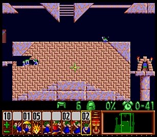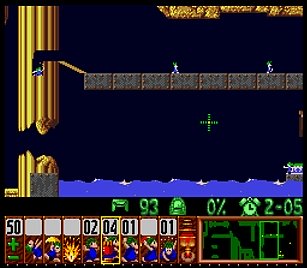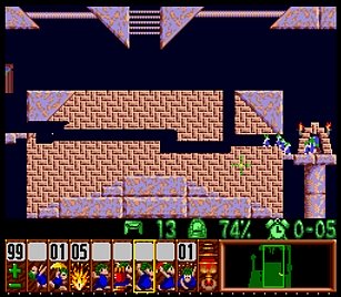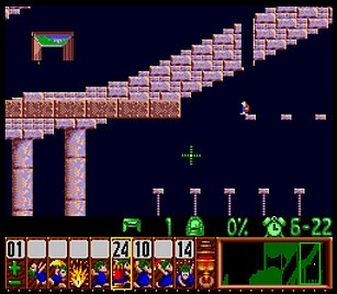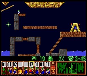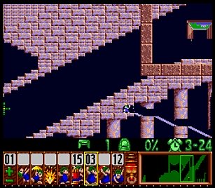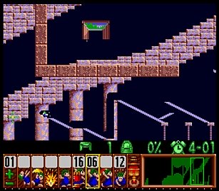であとは一匹目の階段がいい感じにできたら、一匹目は折り返しのためにストップ。うろうろしていたレミングスを階段で前進させ、左方向に階段。このときそのまま階段を進めると落ちたら潰れてしまうので、それをケアするためもう一つ下に階段を同時進行させる。