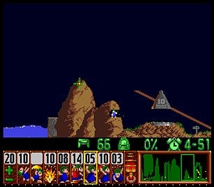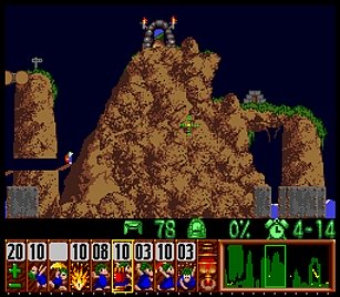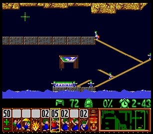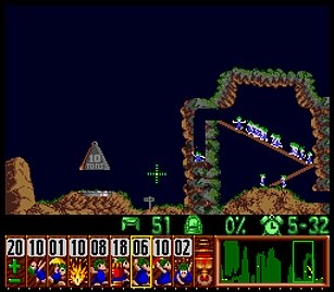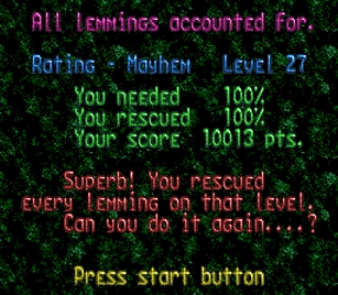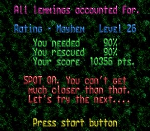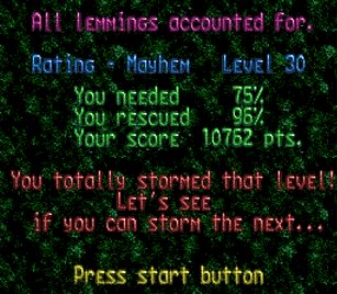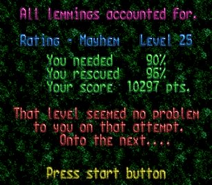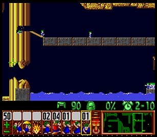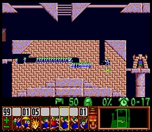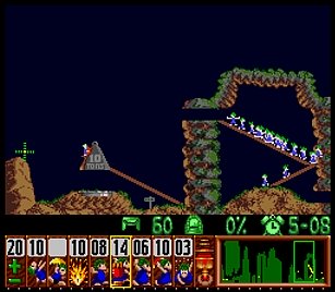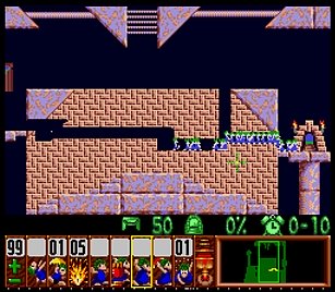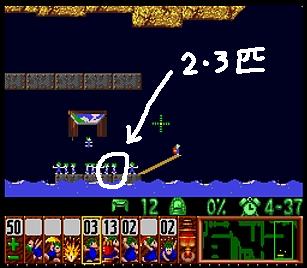 まず先頭の一匹目は右端で階段。二匹目ストップ。三・四匹目ぐらいをスルーしてまたストップ。要はこのストップーストップ間に2・3匹レミングスがうろうろしていればよい。