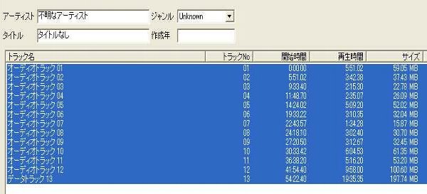 上のうさんくさドライブにCDを挿入したときの画像と比べてもらえればわかるが、今度はデータトラック(13)が認識されていない。そしてリッピングも正常にできて試聴してみてもオリジナルに限りなく近い。つまり完全に成功