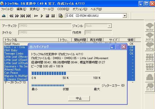 ではいつも使っているエンコーダでmp3に変換してみる。以前はCD2WAV32 → 午後という黄金バッテリーを常用していたが、今はCDexを使っている。標準でLAMEエンコーダ・CDDBとの連係機能などあり、さらにMPEG2-Layer3にも対応しているので、ラジオ音源など低ビットレート(24kbpsとか)で長いものを変換するのに都合がよいためだ。