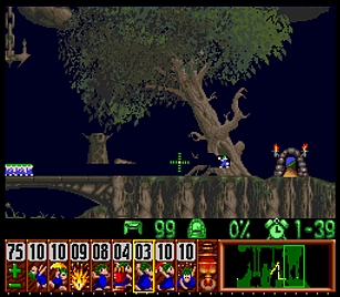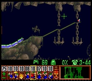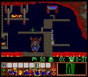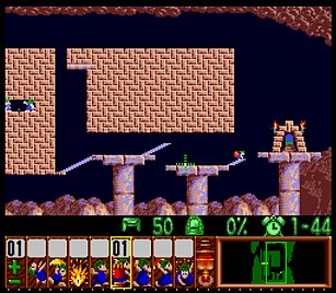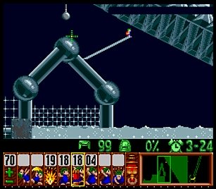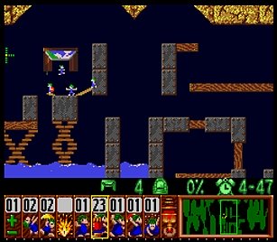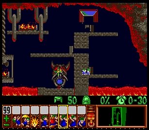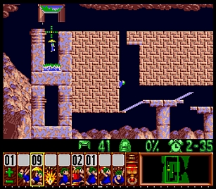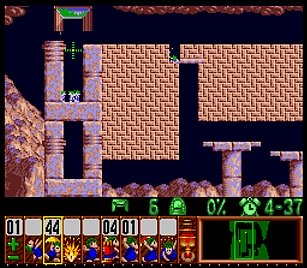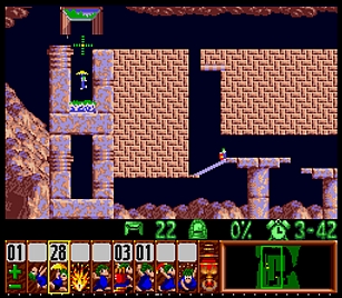 であとは一匹目の階段がいい感じにできたら、一匹目は折り返しのためにストップ。うろうろしていたレミングスを階段で前進させ、左方向に階段。このときそのまま階段を進めると落ちたら潰れてしまうので、それをケアするためもう一つ下に階段を同時進行させる。