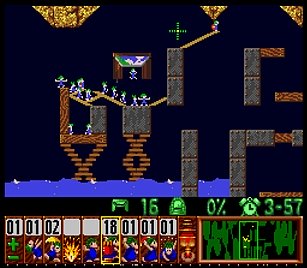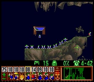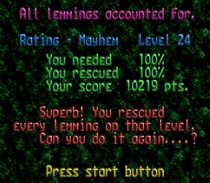まず先頭の一匹目は右端で階段。二匹目ストップ。三・四匹目ぐらいをスルーしてまたストップ。要はこのストップーストップ間に2・3匹レミングスがうろうろしていればよい。