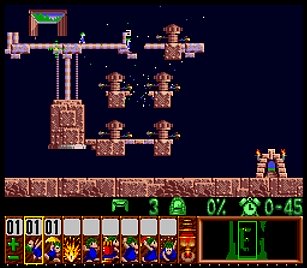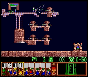 単純に左の入口から出てきたレミングが階段をやっても予想通り向こうまでぎりぎりとどかない。そうなるとは思ったけど、思ったけれどもこうなると厳しい。さてどうしたものだろう。