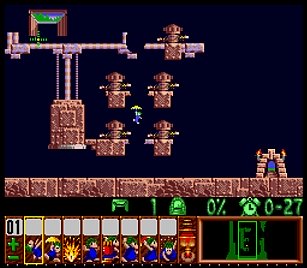 よって発想を最初から変えた。まず一匹目を先発させ二匹目はストップ。入口付近に本隊を貯めておく。そして、先発の一匹は右方向に階段。中央を経由して左方向に階段。これが終わったら、ストップしているレミングの地面を縦掘り→横掘りで崩し、ストップをキャンセルさせる。