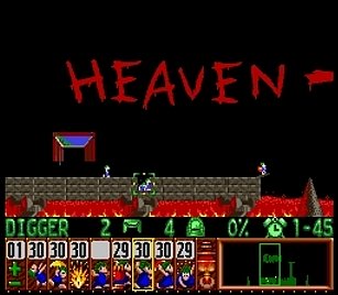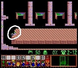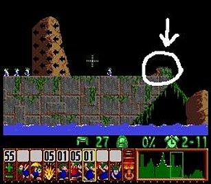 まずはじめの方に出るレミングスを使って図のように丸い球の部分を横掘りで貫通させておく。この段階で横掘りが3つ余っていればよい。