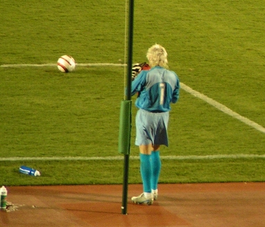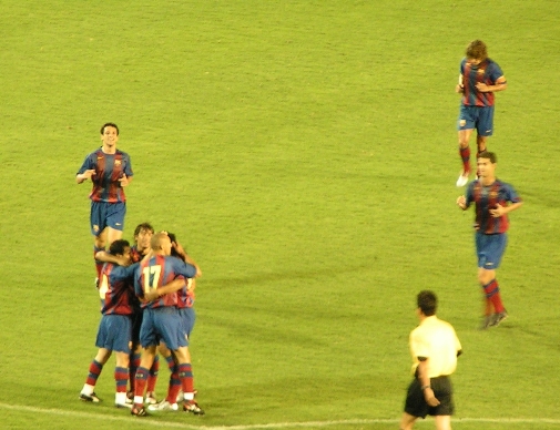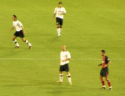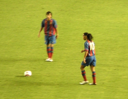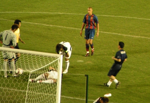 バルセロナ 両ワイドから思い切りよく大胆に攻めるバルセロナのサッカーは素晴らしく、そのアクセントとしてロナウジーニョがかなり機能していた。目立ったのは攻撃時FWがワイドに開いた際に、ロングレンジの強くて長いパスが正確であること。そしてそのパスが通った場合、オートマチックに必ず逆サイドのスペースに誰かがつっこんで厚みを増す。テクニックがある分プレッシャーに対して余裕がある。前日に行くのを決めたにしては、見れて良かった。